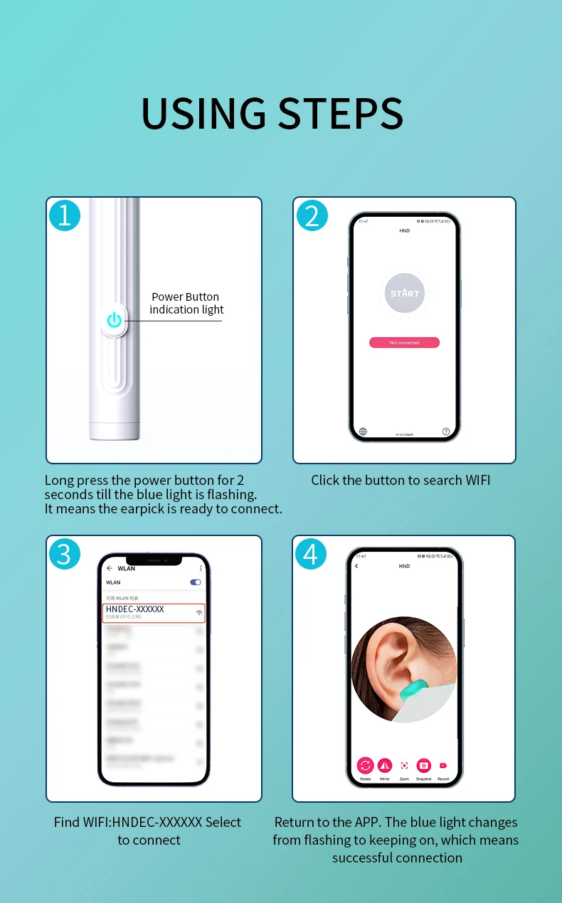 【Easy to Use & Wide Compatibility 】 Scan QR code on manual, download and install the APP on your device, Press and hold the power button on top of device to turn on the ear cleaning rod and then connect WiFi(Name :HNDEC-xxxx) with your device .The APP works with all of Android smartphone / tablet and IOS iPhone / iPad.